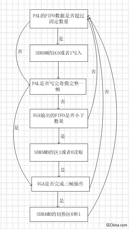 跟两个单独的SDRAM操作不同在于,读写操作不能只等待一个过程,需要及时操作。发现PAL的输入的FIFO满足以后,马上写入数据,如果不满足判断vga输出fifo是否少了固定的数据,是的情况写入固定的数据。