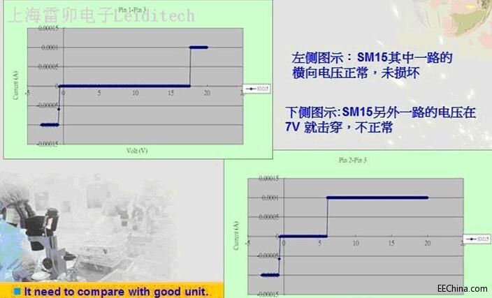 前因:大众汽车电子客户反馈:电路板用SM15做静电保护(具体用途,为客户保密),之前一直用,效果很好。最近发现,装整机时,SM15连接线路中有一条线路不亮。此现象只发生在一颗SM15上。