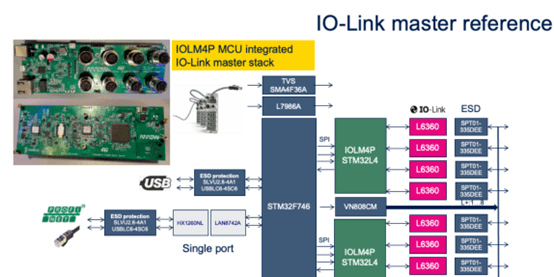 目前ST的IO Link应用广泛,ST使用的是型号为STM32F76的MCU。可以利用它来支持以太网或者现场的工业网络总线。这个板上还有USB口,它可以连接电脑,使用TEConcept的IO-Link tool、IO-Link control Tool进行测试和配置。同时,这板上还有ST的L6360芯片。