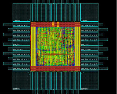 合成完成后,将程式码放进另一套电子设计自动化工具(EDA tool)里面,进行place and route(电路布局与绕线)。在检测的过程中,里面的电路图会出现黄、蓝、绿中带点红的显像;这是设备出问题了吗?不,这些颜色都各自代表着一张光罩。