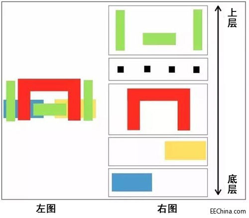 一颗芯片里面包含了很多张的光罩,这些光罩层层叠加,处于不同位置的光罩有属于自己的“使命”。以一组比较简单的元件CMOS(如下图)为例,CMOS全名为Complementary metal–oxide–semiconductor(互补式金属氧化物半导体),是将PMOS和NMOS合成的。从这个CMOS的平面蓝图可以看出,右边从底层开始,依照上面提到的芯片设计制作的方法逐一制作而成(左边图),这就是最后我们看到的最终结果—芯片。