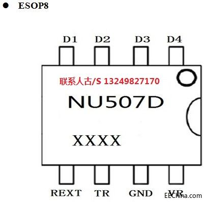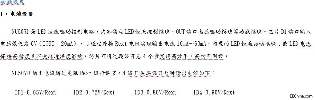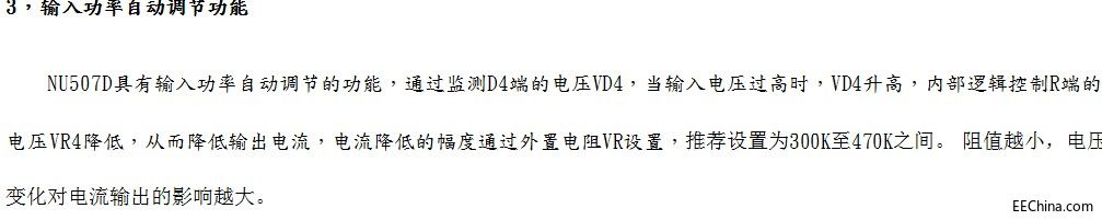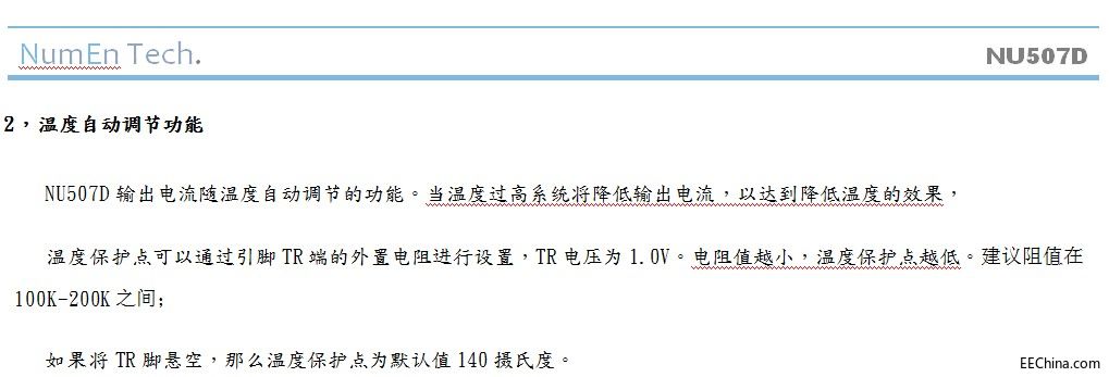 l NU507D具有輸出電流随温度自动调节的功能。當過溫保護啟動時,晶片溫度越高,則輸出電流越低。到達平衡點後,溫度不會再升高,輸出電流也不會再下降,也不會有閃爍現像。温度保護点可以通过引脚TR端的外置电阻进行设置。