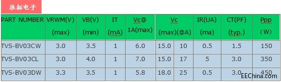 TVS-BV03C系列TVS阵列产品采用SOD-323标准封装,工作电压低(3.0V,3.3V),漏电小(低至0.5uA),结电容低(低至1pF),这给设计人员达到世界各地法规标准带来了更多的自由度。