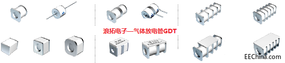气体放电管为低灵敏度保护器件,其工作部分通常用玻璃封装或陶瓷封装,内部为一对相互隔开的冷阴极电极,并充以一定压力的惰性气体(多数为氩气)。为了提高放电管的触发概率,在放电管内还有助触发剂,从结构上分二极型或三极型。