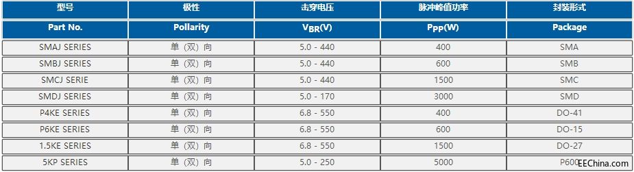 瞬态电压抑制二极管可以按极性分为单极性和双极性两种,按用途可分为各种电路都适用的通用型器件和特殊电路适用的专用型器件。如:各种交流电压保护器、 4~200mA电流环保器、数据线保护器、同轴电缆保护器、电话机保护器等。若按封装及内部结构可分为:轴向引线二极管、双列直插TVS阵列(适用多线保护)、贴片式、组件式和大功率模块式等。