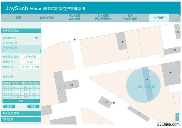 可在养老院内关键区域设置电子围栏,避免意外发生。比如通过在老人居住的房间、某个楼层,甚至在整个养老院内设置电子围栏,一旦老人随意走出该区域,系统第一时间进行报警,提醒监护人员提高警惕,防止老人走失等意外的发生。另外,电子围栏还可实现“长时间滞留预警、静止预警功能”,比如老人在卫生间内长时间滞留,极有可能是发生了突发疾病,而老人没有来得及呼救。通过该功能,可实现无缝监护,防止此类事件的发生。