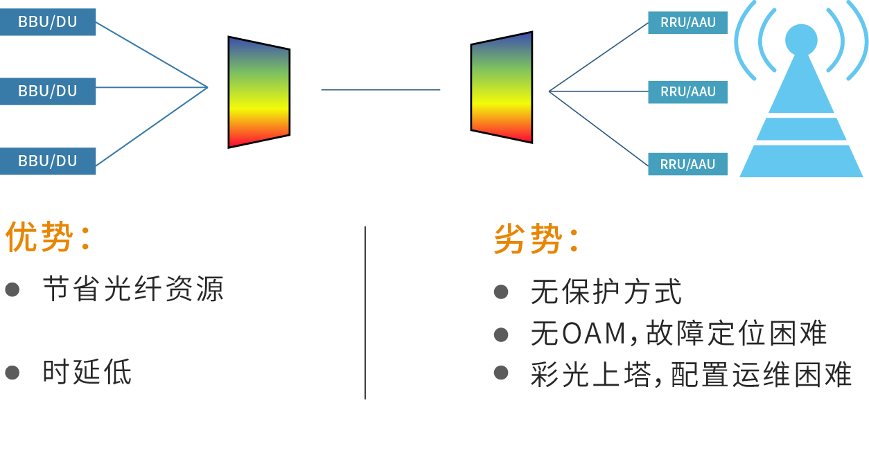 无源WDM方案采用无源合分波器搭配彩光直驱,DU和AAU上采用彩光模块,在DU前端和AAU节点分别配置光合分波器和光分插复用器,利用WDM技术可以大幅降低光纤资源消耗。WDM设备对前传业务进行透传处理不会引入时延,但AAU与DU的波长在物理层上是点对点连接,需要进行复杂的波长规划。在AAU基站直接使用彩光模块会对基站管理提出要求,功率预算也是需要考虑的关键指标。