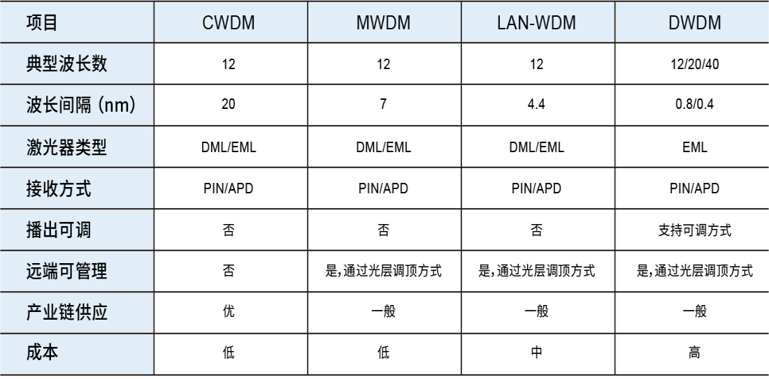 DWDM:参考ITU-T G.698.4(原G.metro),通道间隔为100GHz和50GHz,支持40/80个波长;