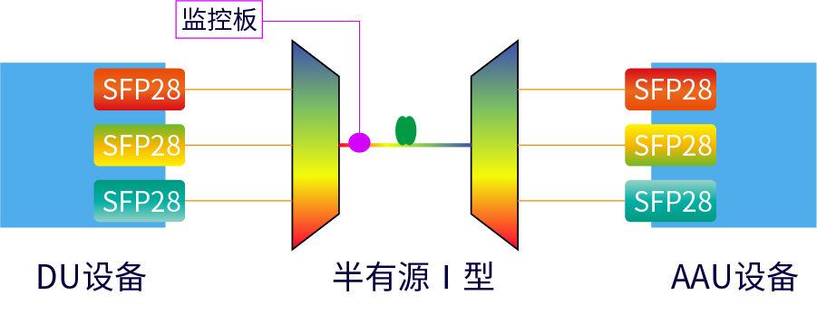 备注:DU侧,彩光模块直接插在DU设备上,半有源设备无灰光模块,内部业务板卡集成WDM波分,PD功率检测和光开关切换实现线路保护