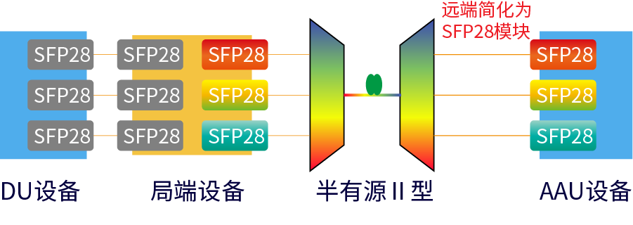 备注:半有源II设备,DU设备内部用灰光模块模块和OTU半有源设备互联,DU侧的彩光模块插在OTU型半有源设备上,该设备实现OEO功能,同时可以对DU上的彩光模块发出控制信号。