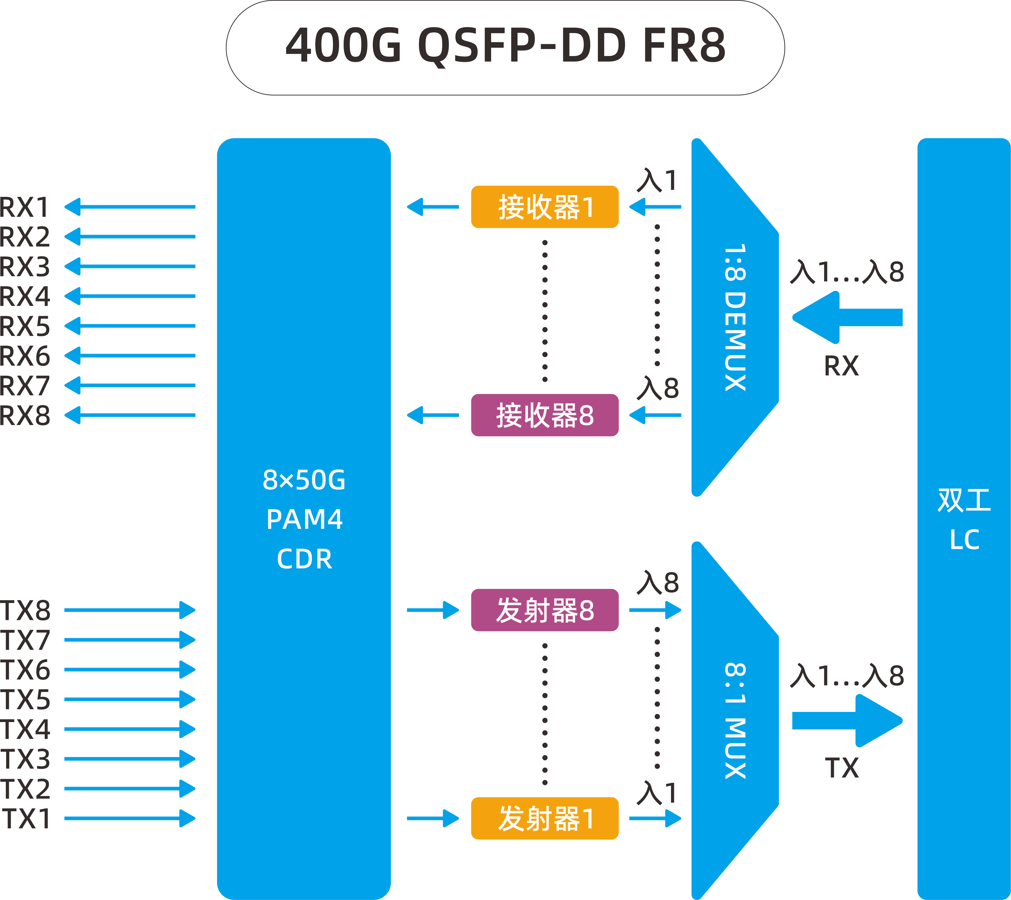 400G QSFP-DD FR4和400G QSFP-DD FR8电口侧都是8路53Gbps PAM4调制,区别在光口侧。FR8光口侧使用8路53Gbps PAM4调制;FR4光口侧采用4路106Gbps PAM4调制,内部则使用Gearbox芯片把两路电口输入复用成一路信号再调制到光上,因此光口侧的速率是电口侧速率的2倍,即4路106Gbps PAM4信号。50G PAM4升级至100G PAM4调制,色散容限下降。