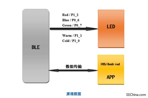 蓝牙灯模组主要是获取 APP 发送的数据命令,根据对应的命令控制 PWM 的输出实现 LED 模式变化。它也可以根据 APP 的需求回传有关蓝牙灯当前状态的信息。