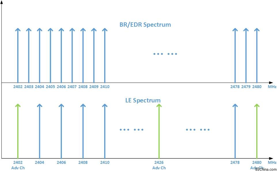 Bluetooth Smart采用的信道与蓝牙BR/EDR有些不同,尤其是在Bluetooth Smart引入了广播信道。