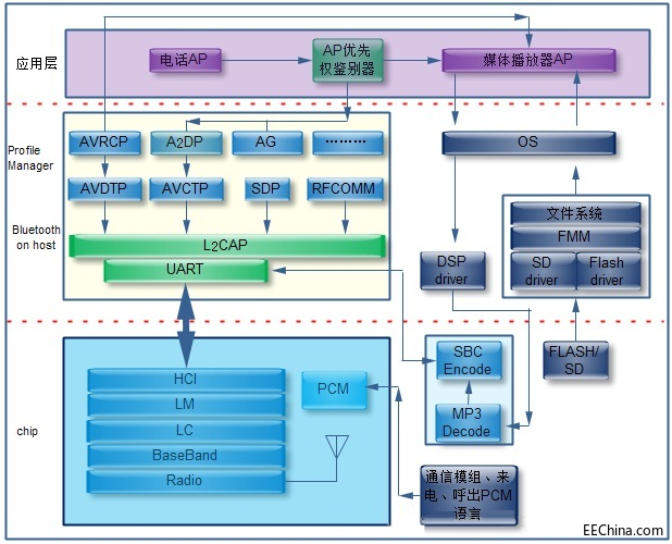 4、蓝牙软件协议实现:如上图紫色部分,这个后面我们做详细说明。