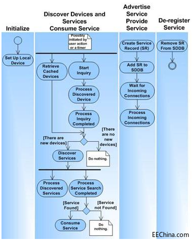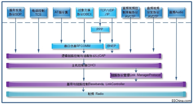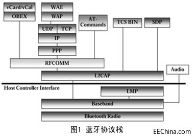 除上述协议层外,规范还定义了主机控制器接口(HCI),它为基带控制器、连接管理器、硬件状态和控制寄存器提供命令接口。在图1中,HCI位于L2CAP的下层,但HCI也可位于L2CAP上层。