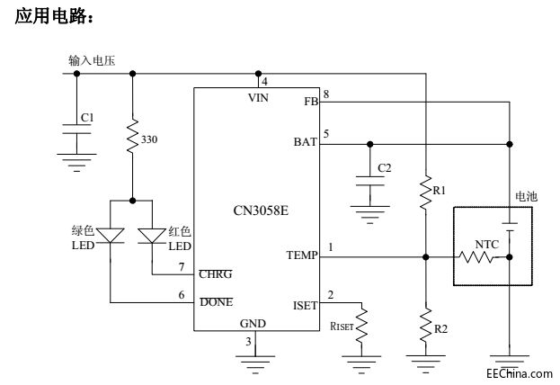 CN3058E是可以对单节磷酸铁锂电池进行恒流/恒压充电管理的集成电路。该器件内部包括功率晶体管,不需要外部的电流检测电阻和阻流二极管。热调制电路可以在器件的功耗比较大或者环境温度比较高的时候将芯片温度控制在安全范围内。内部固定的恒压充电电压为3.6V,也可以通过一个外部的电阻调节。充电电流通过一个外部电阻设置。当输入电压(交流适配器或者USB电源)掉电时,CN3058E自动进入低功耗的睡眠模式,此时电池的电流消耗小于3微安。