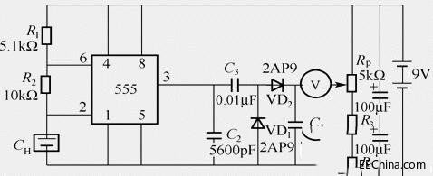 图2所示电路中,由555时基电路、湿度传感器CH等组成多谐振荡器,在振荡器的输出端接有电容器C2,它将多谐振荡器输出的方波信号变为三角波。当相对湿度变化时,湿度传感器CH的电容量将随着改变,它将使多谐振荡器输出的频率及三角波的幅度都发生相应的变化,输出的信号经VD1,VD2整流和C4滤波后,可从电压表上直接读出与相对湿度相应的指数来。Rp电位器用于仪器的调零。