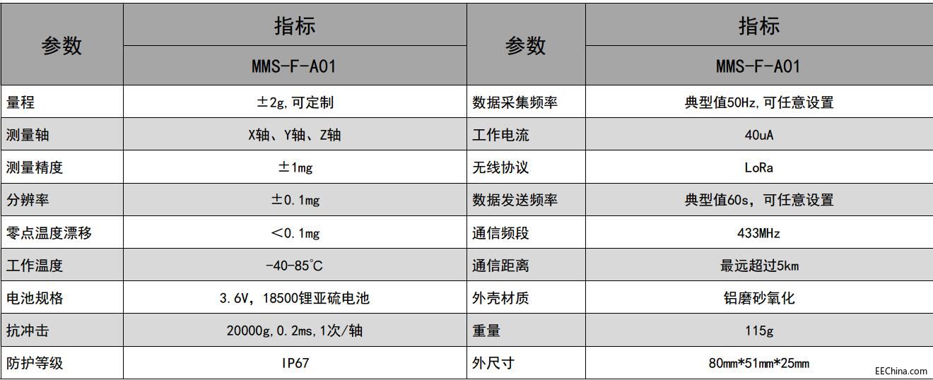 无线加速度传感器采用最先进的无线物联网技术——LORA技术,同时具有低功耗和长距离通信的特性,通信距离可达5km,传感器引进欧洲专利技术的
