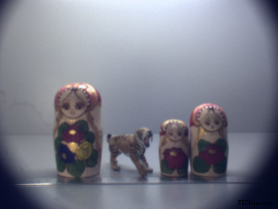 当液晶透镜不加电(图一)时,对无穷远处对焦,近处物体模糊;当液晶透镜加电(图二)时,液晶透镜区域工作,对焦于图中老虎部分;可以看出前后明显的清晰度差别。