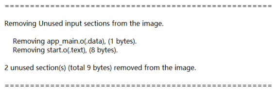 上图中最后一行信息:“2 unused section(s) (total 9 bytes) removed from the image”。表示总共有2段内容没有被调用,大小9字节。