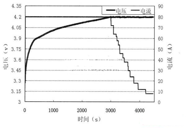 为了测试该系统, 使用3. 7V /80Ah的锰酸锂电池做恒流恒压充电试验。在上位机程序中设置如下参数: 恒流阶段充电电流80A, 充电截止电压4. 2V,恒压阶段截止电流0. 1A, 得到的充电曲线如图4所示。