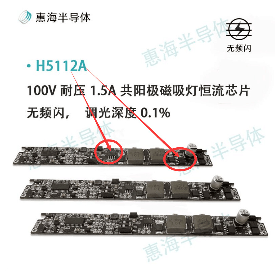 东莞市惠海半导体有限公司专业研发、设计、生产、销售5-100V输入DC-DC降压恒流调光IC,具有可共阳无频闪高辉度的特点。适用于LED磁吸灯、舞台灯、景观亮化照明、洗墙灯、摄影补光灯、智能家居照明等低压照明方案中。惠海半导体H5112A是一款专业应用于48V智能磁吸灯共阳极双路调光调色的LED降压恒流驱动器,性能优异、调光效果好。惠海半导体H5112A在LED磁吸轨道灯市场已经广泛应用,出货量大、成熟稳定可靠。惠海半导体可为客户提供可靠稳定、调光平滑细腻、无频闪、共阳极的LED智能磁吸灯解决方案。
