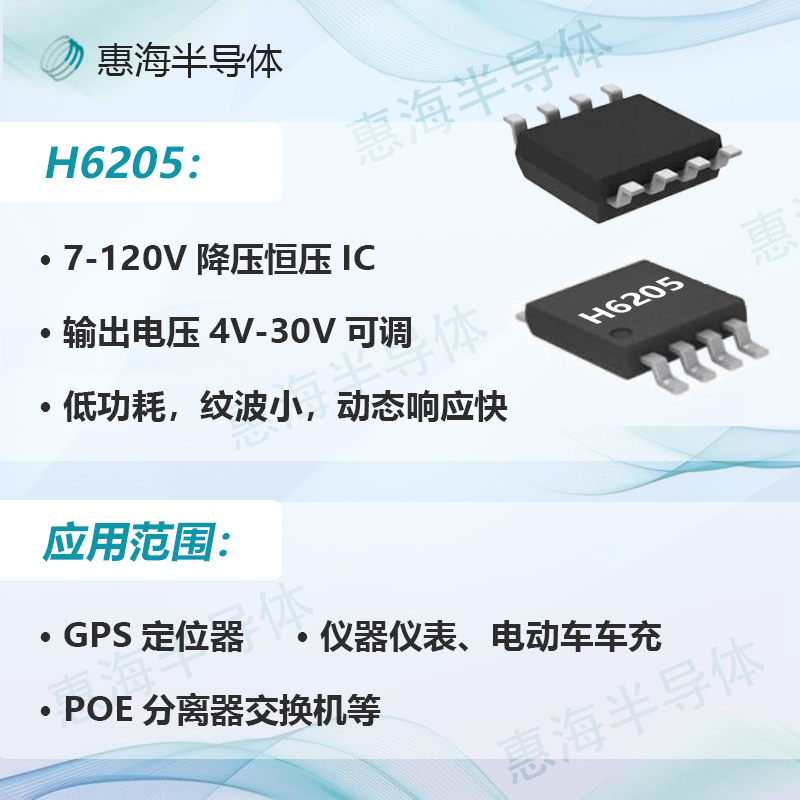 东莞市惠海半导体有限公司有限公司是设计、研发、生产与销售集成电路IC和MOS管的技术服务型公司,8-100V输入的降压恒压芯片--H620X系列可应用在电动车车充/车载仪表降压电源、BMS电池管理系统降压电源、POE交换机/分离器降压电源和GPS定位器降压电源等。H620X系列产品已经在电动车、POE和GPS等行业应用多年,各大厂商都有在使用。惠海半导体可为客户提供全面的方案设计及技术支持。