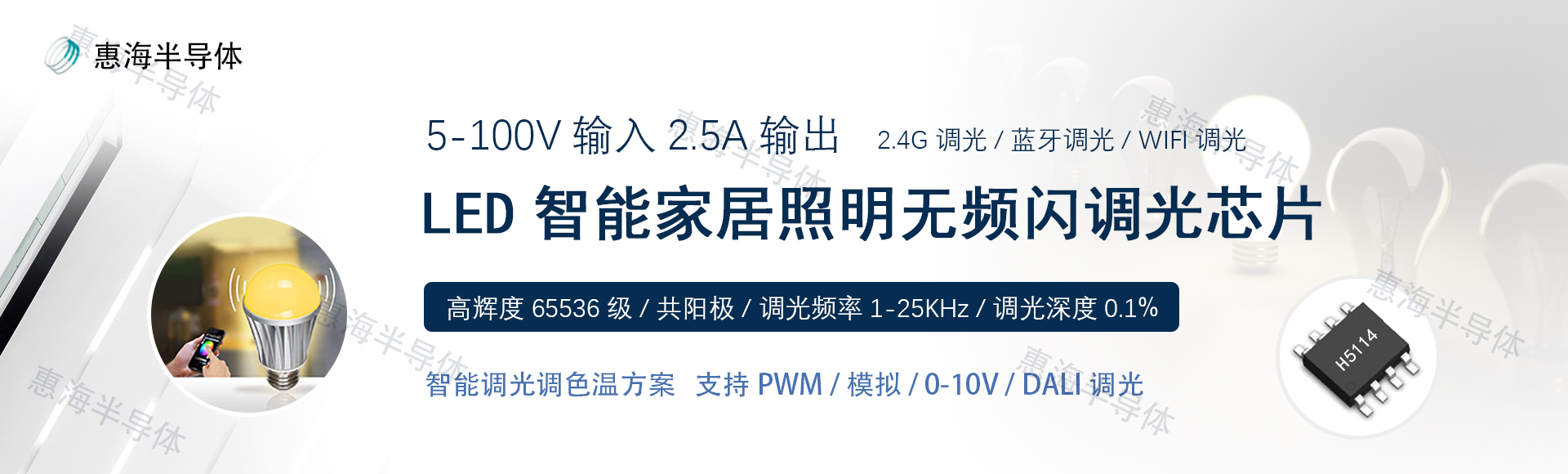 H5114支持65536级高辉调光,高辉高刷,调光频率范围1KHz-25KHz,高频调光无频闪
