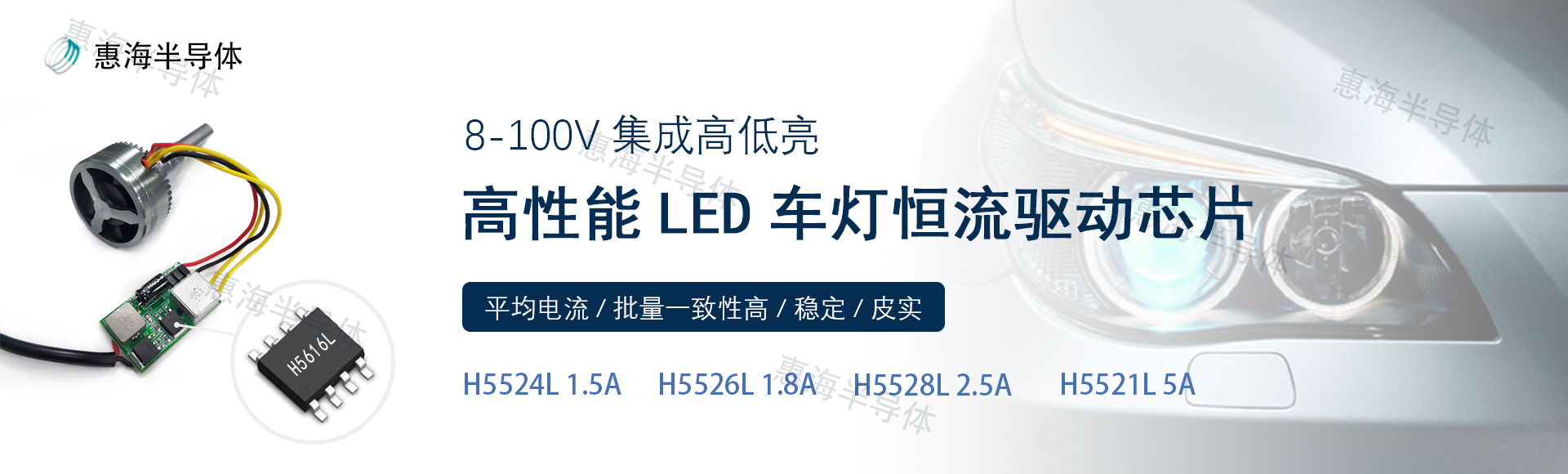 惠海半导体提供高性能、高性价比,DC-DC宽电压5-100V输入的LED电动车灯恒流驱动IC、LED汽车大灯恒流驱动IC、LED摩托车灯恒流驱动IC、LED低压球泡灯/夜市灯/地摊灯恒流驱动IC等。