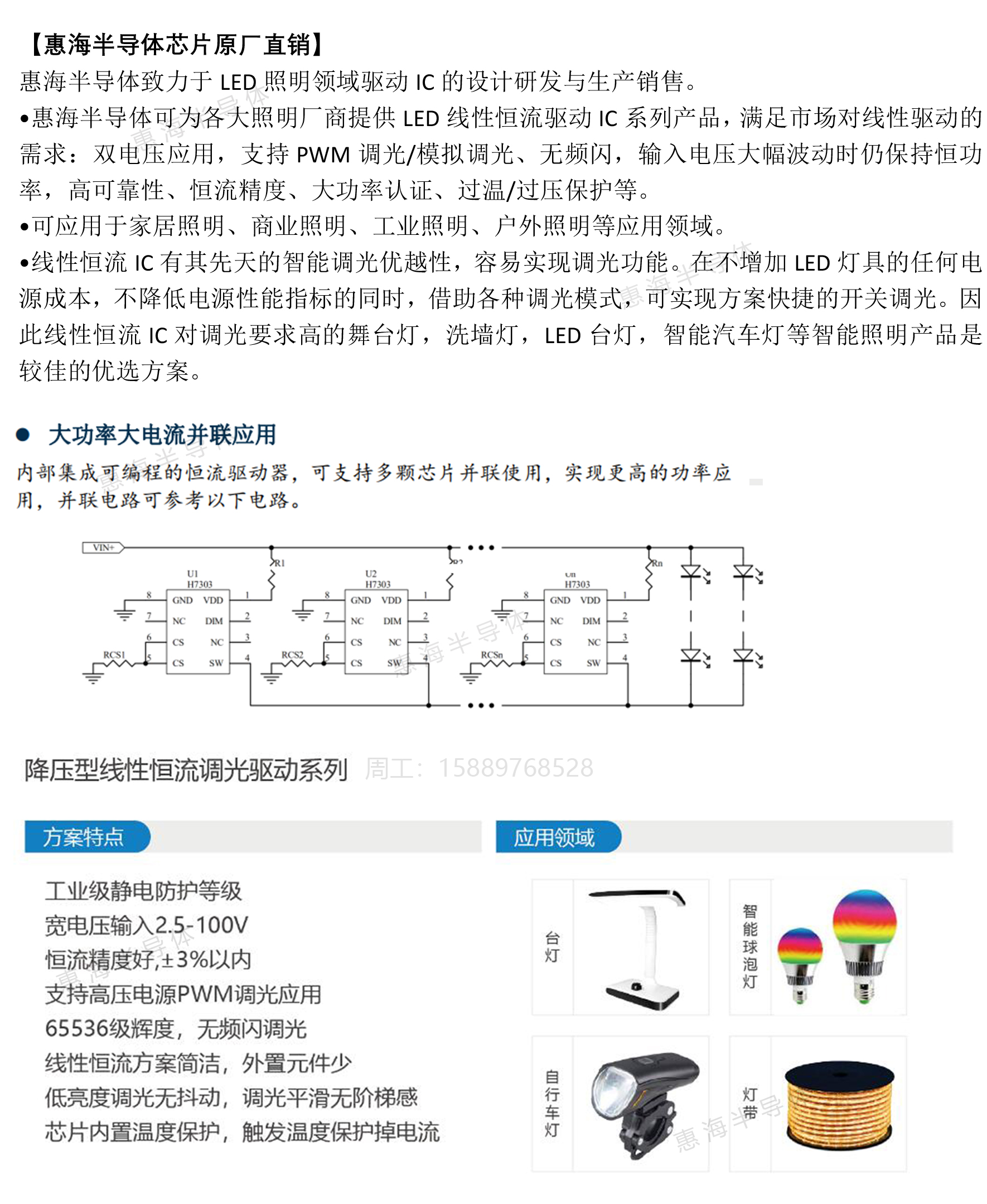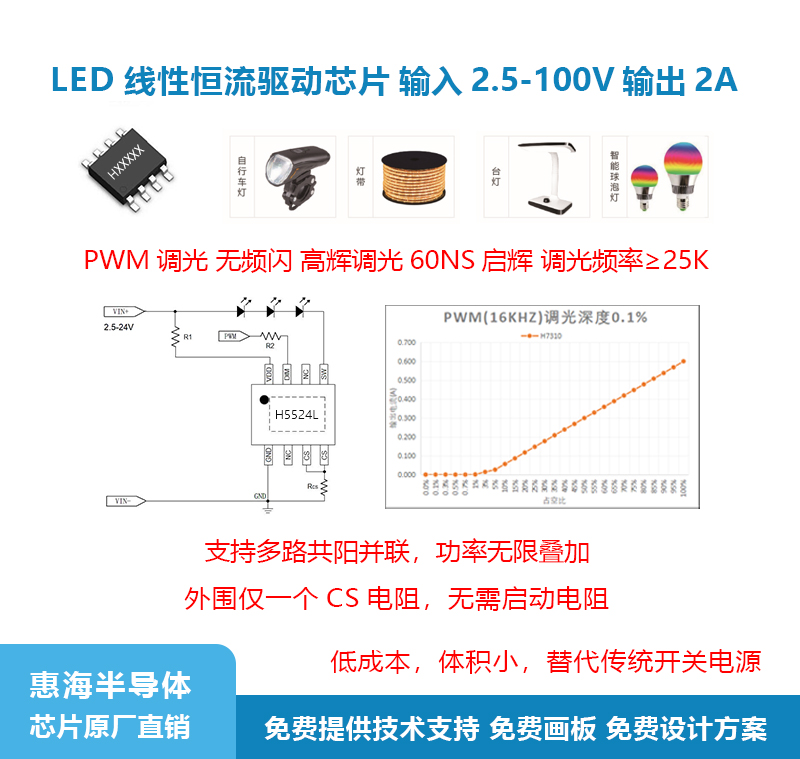 2.5-100V低压线性恒流无电感方案H730X,外围仅一个CS电阻调光辉度65536级,调光频率≤25K支持并联电流叠加功率无限大应用专注调光高性能线性恒流方案低亮度0.1%开始启辉,调光比1000:1