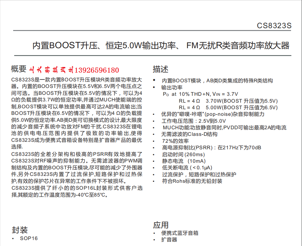 CS8323S是一款内置BOOST升压模块R类音频功率放大器。内置的BOOST升压模块在5.5V和6.5V两个电压点之间可选。当BOOST升压模块在5.5V的情况下,可以为4 Ω的负载提供3.7W的恒定功率,并通过MUCH使能端的控制,BOOST模块可以单独提供最高可达2A的电流输出;当BOOST升压模块在6.5V的情况下,可以为4 Ω的负载提供5.0W的恒定功率。AB类D类可切换模式的设计,最大限度的减少音频子系统中功放对FM的干扰。