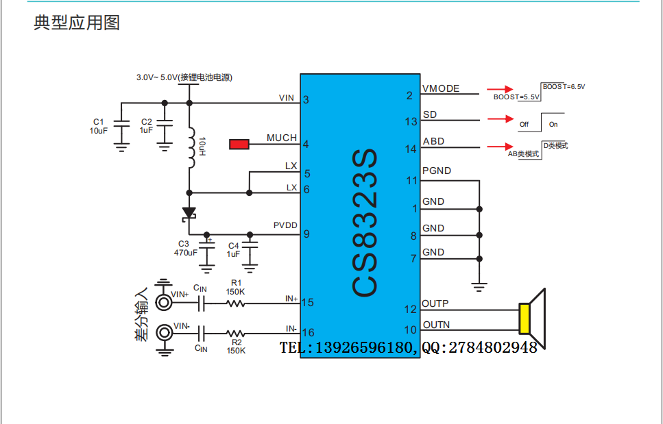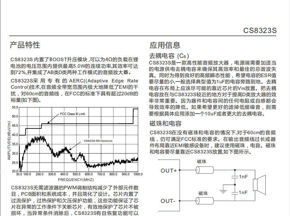 CS8323S在锂电池的供电电压范围内提供了极致的功率输出,使得CS8323S成为便携式音箱设备特别是扩音器产品的最优选择. CS8323S的全差分架构和极高的PSRR有效地提高了CS8323S对RF噪声的抑制能力。无需滤波器的PWM调制结构及内置的BOOST升压模块,尽可能的减少了外围器件,另外CS8323S内置了过流保护,短路保护和过热保护,有效的保护芯片在异常的工作条件下不被损坏。