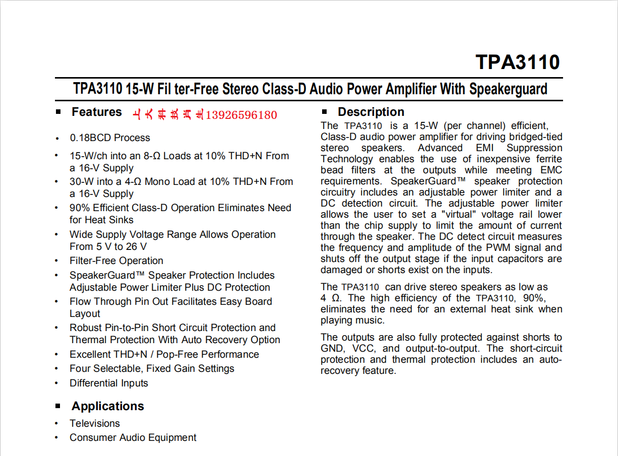 15-W/ch到10%的8-Ω负载10%THDN从16-V供应,30-W4-Ω单声道负载10%THDN从16-V提供,90%高效D类免除散热槽,广泛的供应电压范围,允许从5V到26V无过滤器,扬声器保护,包括可调功率器+直流保护。方便简单的板布局,强大的针对短路保护和热保护与自动恢复。良好的失真和防噗声功能,固定增益设置,差分输入。