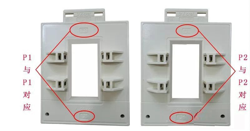 2、开口互感器在安装时须保证上壳体的P1与下壳体P1在同一侧面对应,P2与P2同一侧面对应(如图1)。开口互感器的铁芯须上、下配对使用,不配对的铁芯安装后接触面会产生缝隙,此时互感器使用时发出响声;为此当开口互感器运行发出响声时检查上、下壳体的同一侧面P1、P2是否对应。