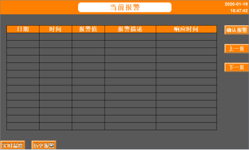 可查看“当前报警”和“历史报警”事件。有报警时,“当前报警”显示出报警提示,并触发蜂鸣器,此时确认报警,蜂鸣器停止鸣叫,同时报警提示的字体变为蓝色,当报警故障解除后,报警提示消失。