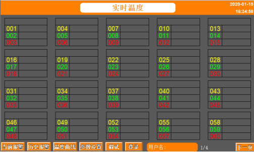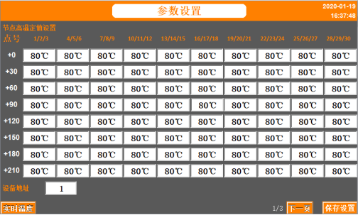 用户“登录”后,可通过“参数设置”菜单设置无线温度传感器组的高温告警值和名称;当测得温度值超出设定值时,触摸屏显示告警并触发蜂鸣器。