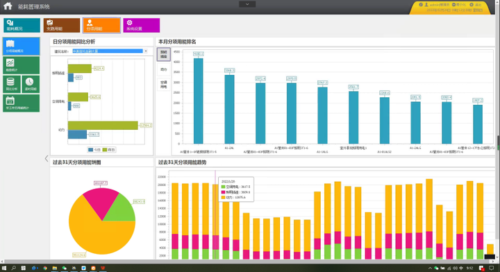 Acrel-5000能耗管理系统可以按照分项进行能耗统计与显示。其中,日分项用能同比分析图显示不同分项的当日与昨日能耗柱状图(蓝色柱表示今日,绿色柱表示昨日);用能饼图显示各分项过去31天的用能占比;堆积图显示各分项过去31天的能耗趋势;分项用能排名图显示被选中分项对应能耗值排名前10位的支路。