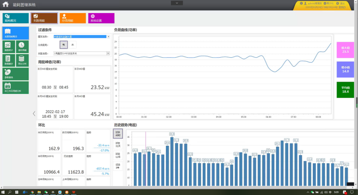 Acrel-5000能耗管理系统可以根据分类能耗的支路名称查询用能情况,显示当日和当月的用能峰值、当日用能、当月用能、当年用能以及昨天同期用能、上月同期用能、上年同期用能的比较情况;以柱状图显示过去48小时、31天、12个月、3年的能耗情况;以曲线图显示15分钟的负荷用能走势(电表显示功率曲线,流量表显示流速曲线),并显示当前值、15分钟内的峰值。