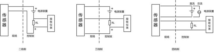 二线制是两根导线供电的同时传输DC4-20mA标准信号;三线制就是电源正端用一根线,信号输出正端用一根线,电源负端和信号负端共用一根线,用于电压参考点和电流回路,其供电大多为DC24V,输出信号有DC4-20mA标准信号;四线制就是供电回路和信号回路各自独立,采用隔离电路分开,两根线负责电源的供应,另外两根线负责输出信号(如电压、电流等)。