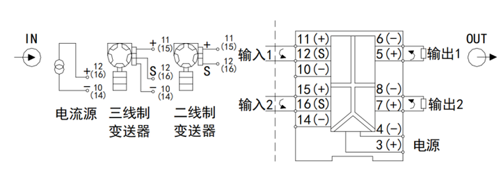 举例 1 输入:1 路 4-20mA,输出:2 路 4-20mA,工作电源:24V DC