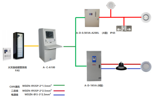 本项目采用的方案是,灯具到集中电源通常二总线用法,集中电源到琴台控制器中间使用CAN总线接法,由应急照明控制器至集中电源和分配电装置采用手拉手接线时,通讯线长度不大于2000m,自由拓扑接线时,通讯线长度不大于500m。