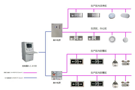 现场设有一台A-C-A100控制器、多台防爆集和高防护的集中电源、多套灯具。本项目采用的方案是,灯具到集中电源通常二总线用法,集中电源到琴台控制器中间用的是CAN总线。