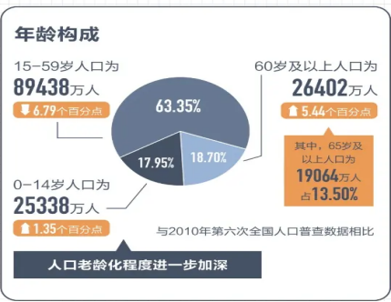 2021年5月11日上午10时,国务院新闻办公室召开新闻发布会,介绍第七次全国人口普查主要数据结果。60岁及以上人口为26402万人,占18.70%(其中,65岁及以上人口为19064万人,占13.50%)。与2010年相比,60岁及以上人口的比重上升5.44个百分点。