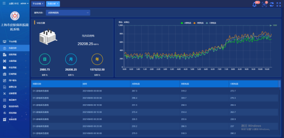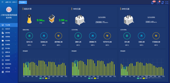 平台详情展示当前医院用能数据,折算成标煤及二氧化碳数据以及变压器详细数据、日、月、年用能趋势等信息。