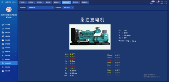 当前页面主要展示柴油发电机运行时的电压、电流、有功功率、无功功率、视在功率、频率、转速以及水温等参数。