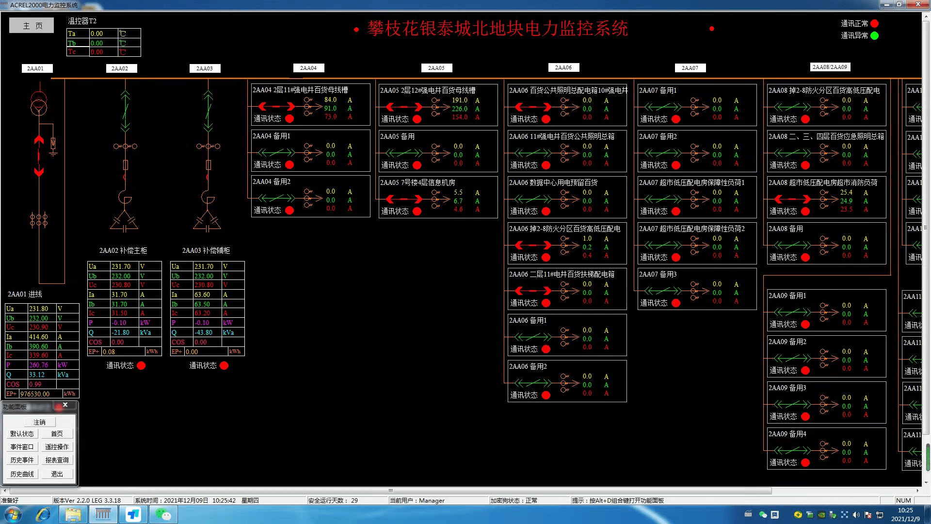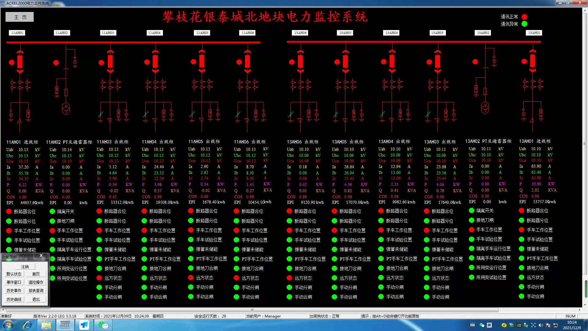 配电所实时监控系统图为主监控画面,主要实时监测攀枝花银泰城北地块项目变电所内所有配电回路的运行状态。在系统图中可以直观的看到每路10KV配电柜及低压进出线回路的运行参数和状态,如:三相电压、电流、有功功率、无功功率、功率因数、频率等。