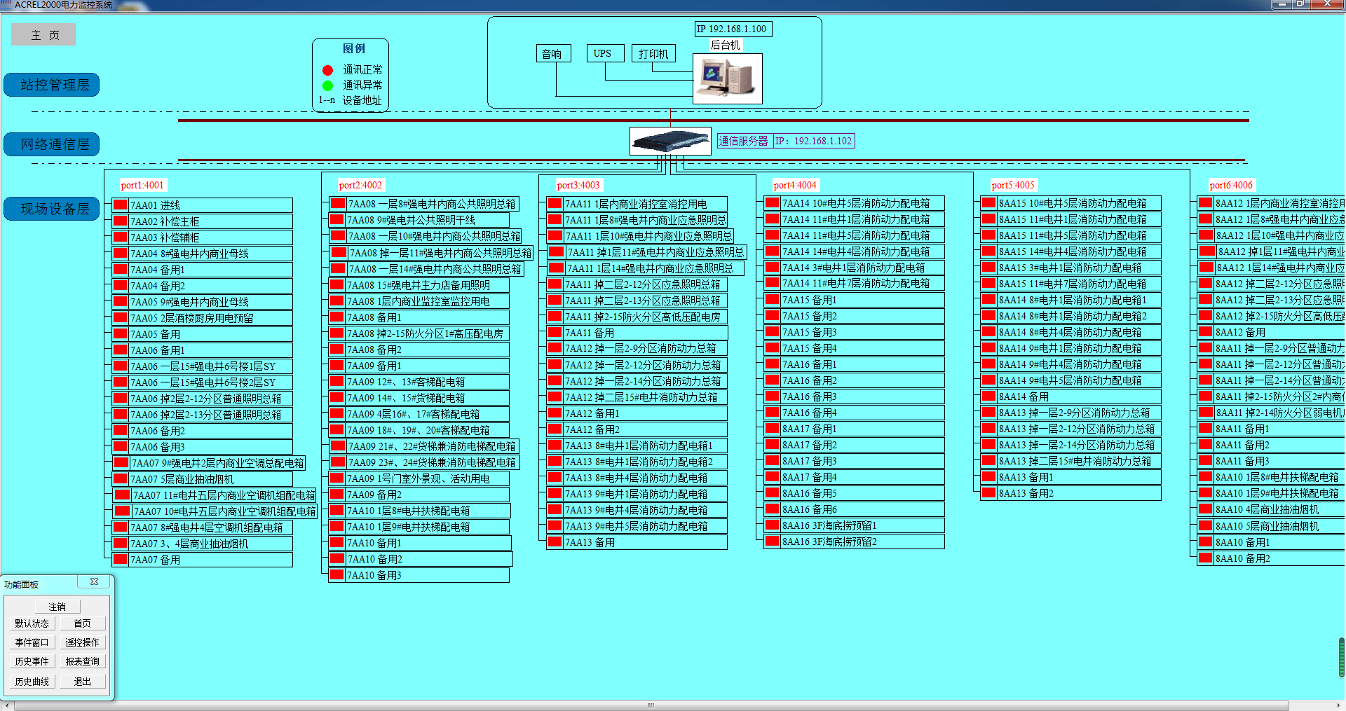 其中1#高压配电房及外.空ES低压配电房内共有19台微机保护、19块多功能高压仪表,148块多功能低压仪表,63块低压单相电流表;百货高低压配电房内共有2块多功能高压仪表,62块多功能低压仪表,10块低压单相电流表;内商低压配电房(内商ES)配电房内共有4台微机保护、5块多功能高压仪表,126块多功能低压仪表,69块低压单相电流表;酒店低压配电房内共有3台微机保护、4块多功能高压仪表,53块多功能低压仪表,3块低压单相电流表;超市高低压配电房内共有3台微机保护、3块多功能高压仪表,54块多功能低压仪表,32块低压单相电流表;16#楼商业配电室内共有3台微机保护、5块多功能高压仪表,7块多功能低压仪表。