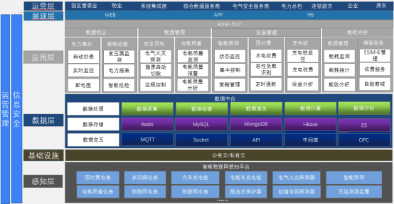 上层的应用层是指Acrel-EIoT能源物联网云平台,主要实现各种功能应用,平台按照能源的流向分为能源供应、能源管理、设备管理和能耗分析4大板块,其中能源供应包括电力集抄、智能运维子模块,能源管理包括安全用电、电能质量子模块,设备管理包括智能照明、预付费、充电桩子模块,能耗分析包括能源管理、增值服务子模块。平台通过web和app的方式为用户提供人机交互的界面,运营层的各类用户可以通过这两种方式实现平台的访问与操作。
