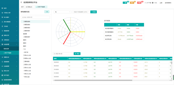 电能质量监测,包括三项不平衡度、谐波、功率因数,以矢量图的形式展示三相不平衡度。三项不平衡或功率因数过低时产生报警,触发APP、手机短信、邮件、钉钉、语音等多种方式提醒。