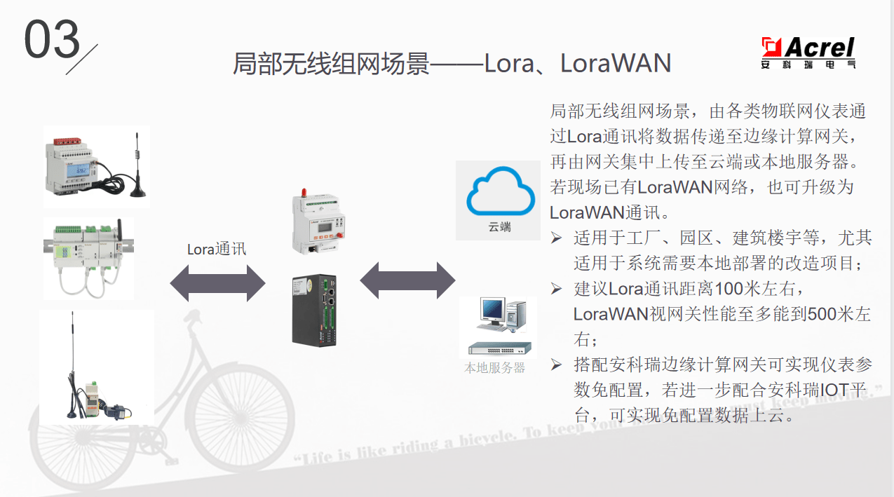 局部无线组网场景,由各类物联网仪表通过Lora通讯将数据传递至边缘计算网关,再由网关集中上传至云端或本地服务器。若现场已有LoraWAN网络,也可升级为LoraWAN通讯。